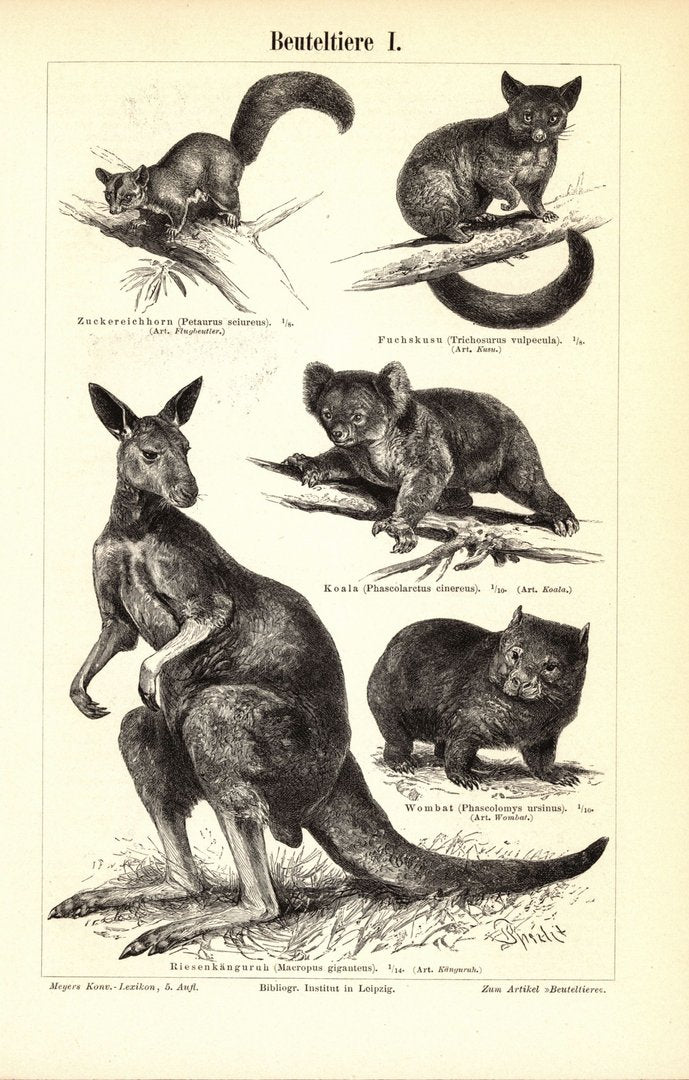 Beuteltiere. Buchillustration (Stich) von 1893
