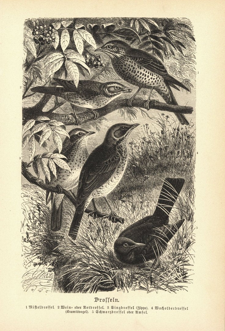 Drosseln, Vogel. Buchillustration (Holzschnitt) von 1890