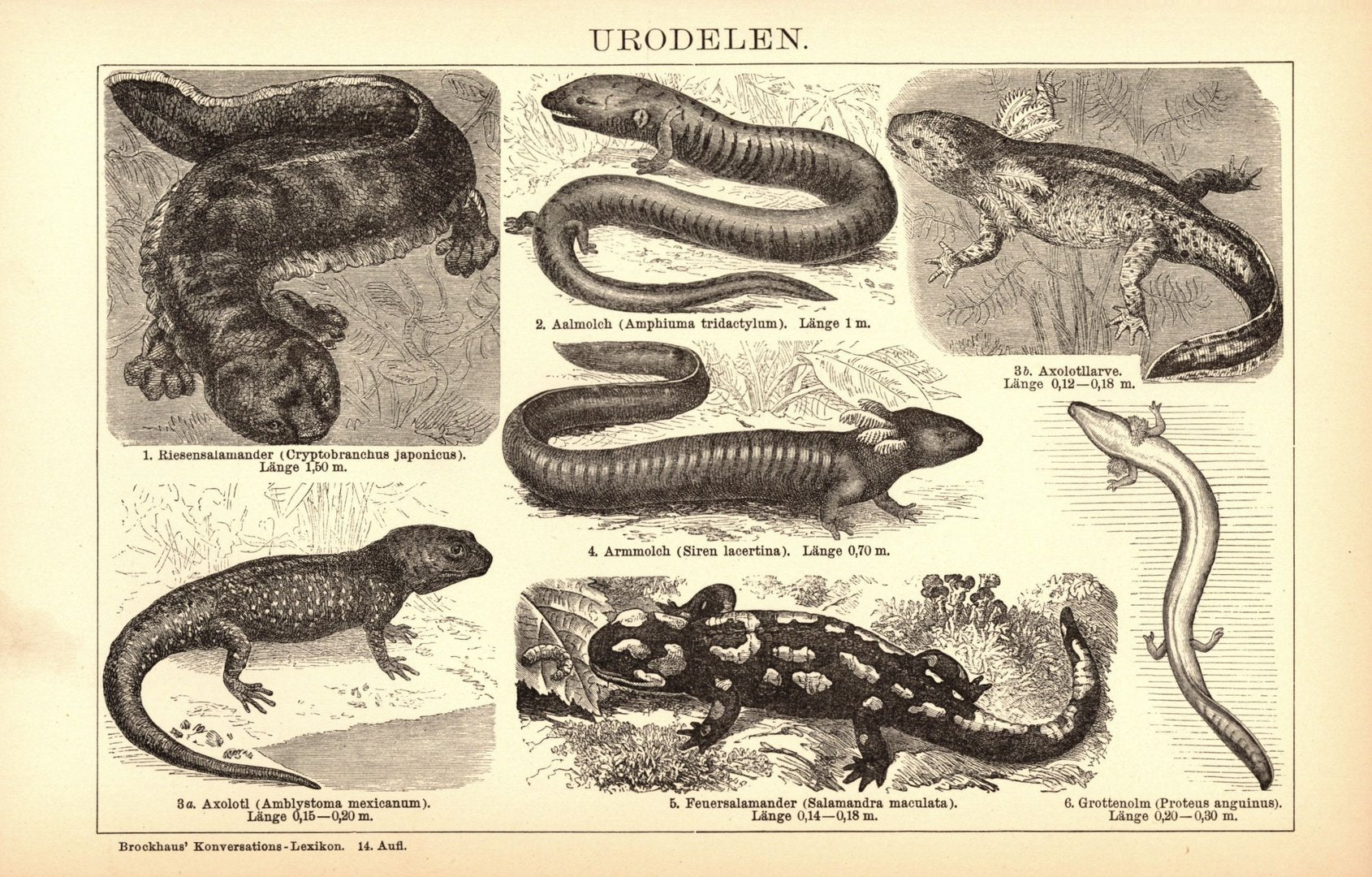 Echsen, Urodelen. Buchillustration (Stich) von 1897
