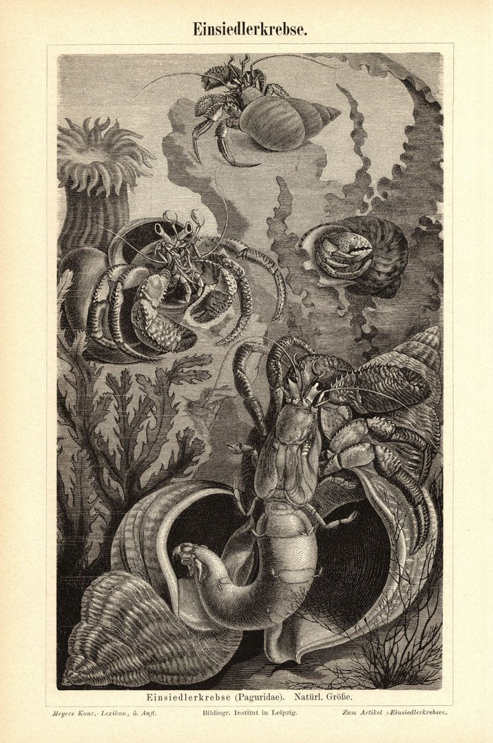 Einsiedlerkrebse. Buchillustration (Stich) von 1895