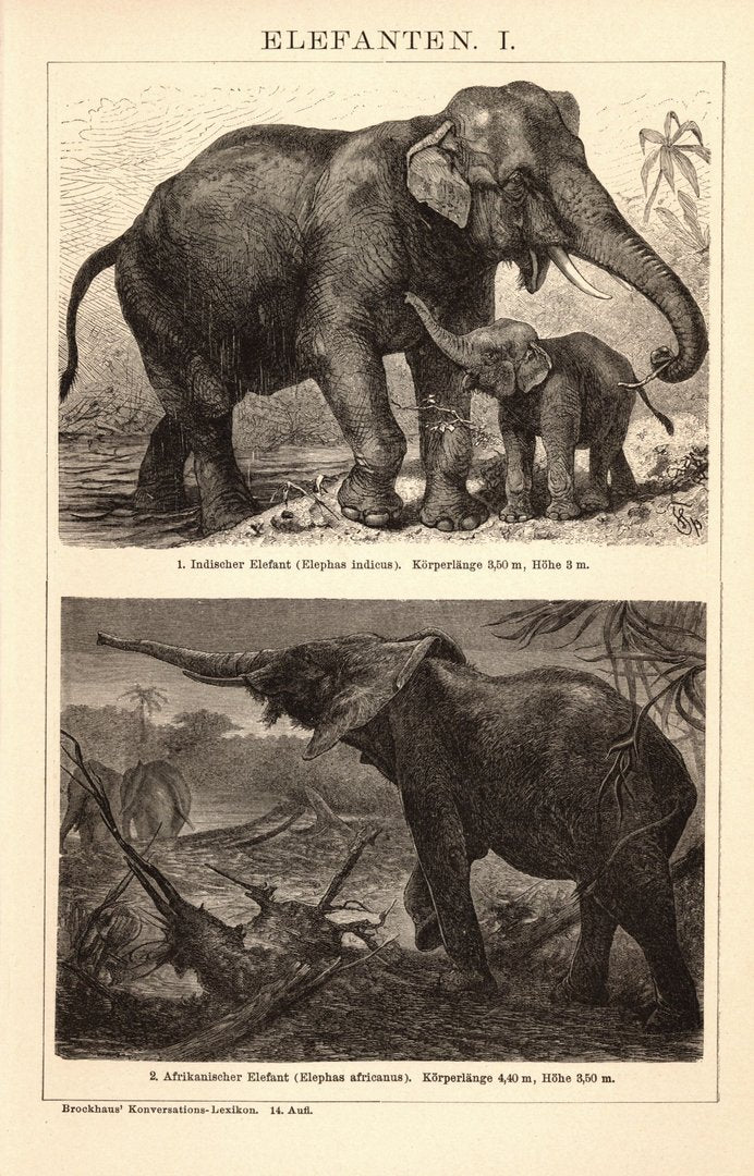 Elefanten. Buchillustration (Stich) von 1897