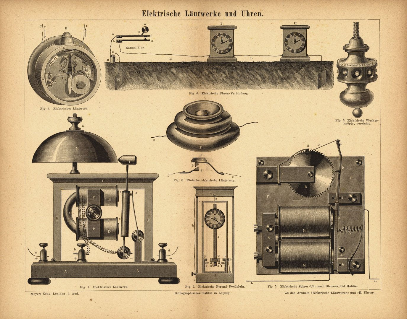 Elektrische Läutwerke und Uhren. Buchillustration (Stich) von 1875