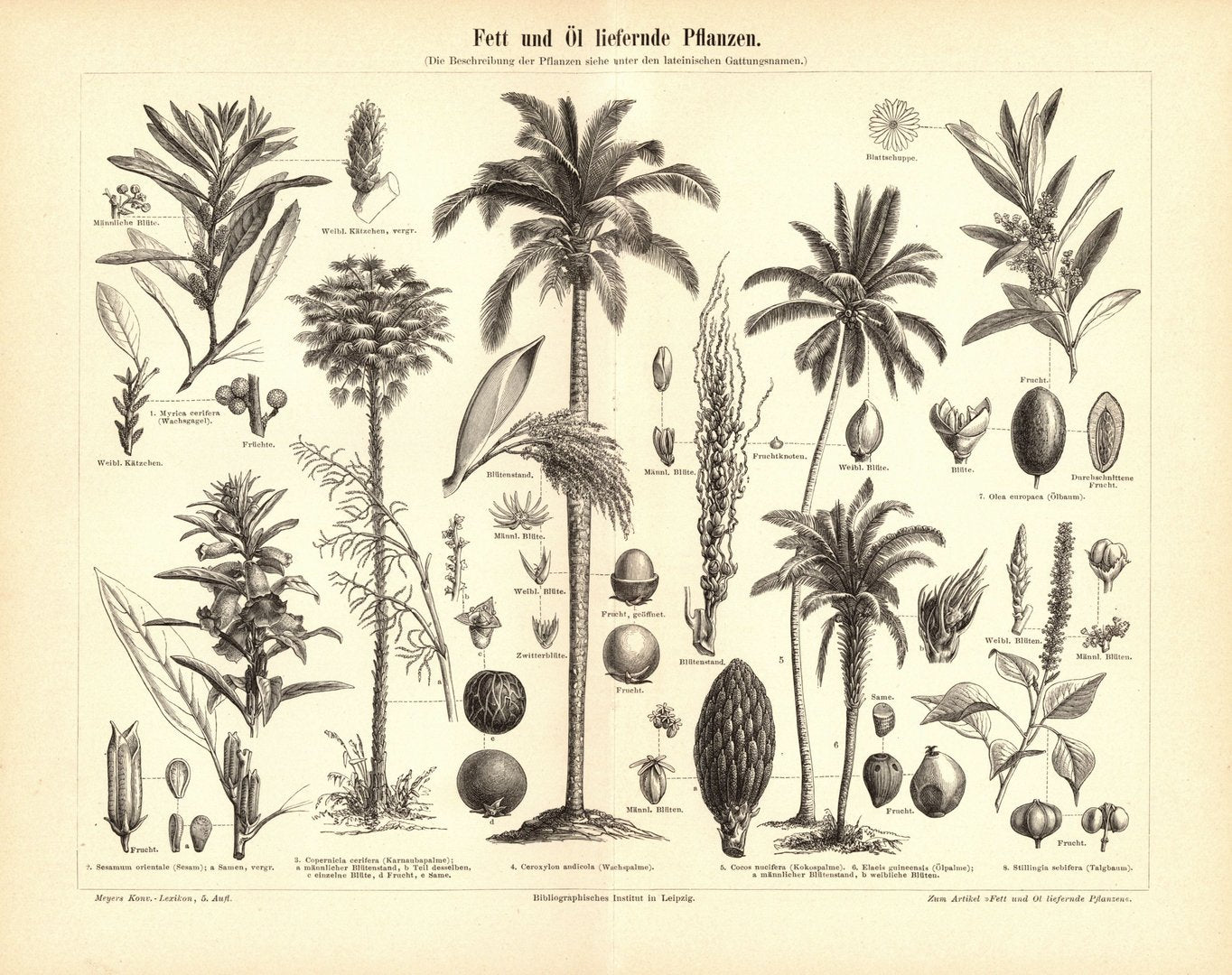 Fett und Öl liefernde Pflanzen. Buchillustration (Stich) von 1895