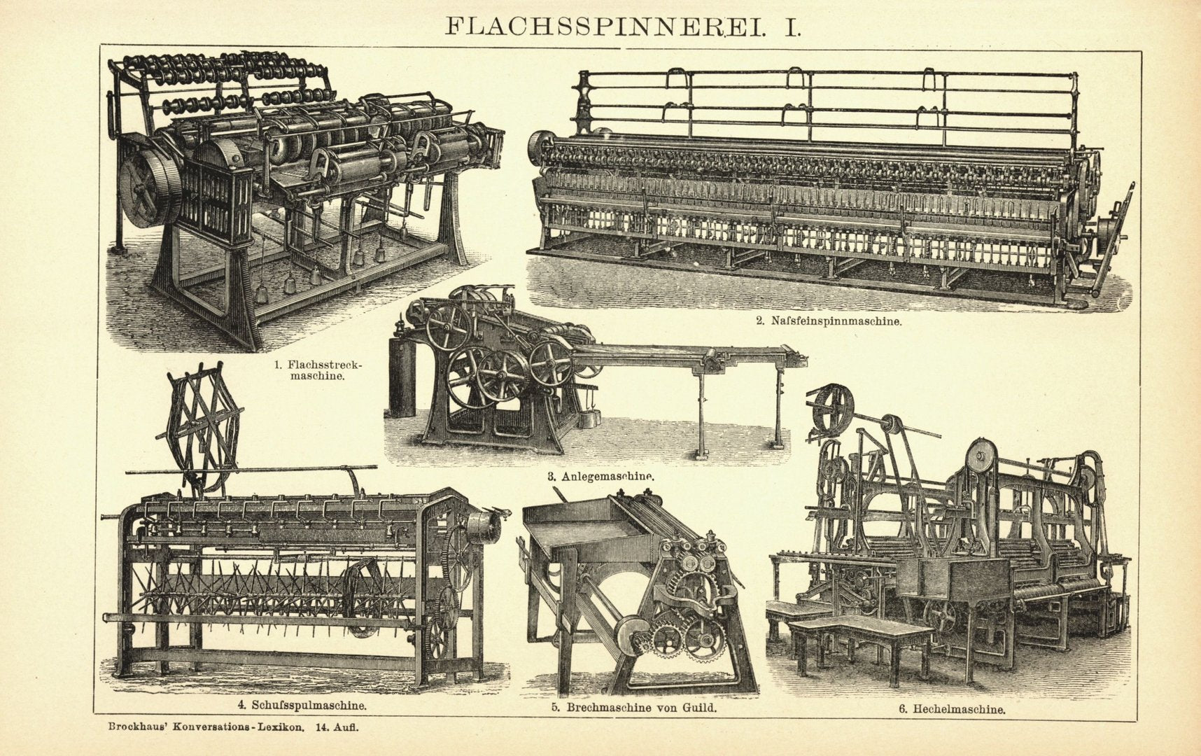 Flachsspinnerei. Buchillustration (Stich) von 1894