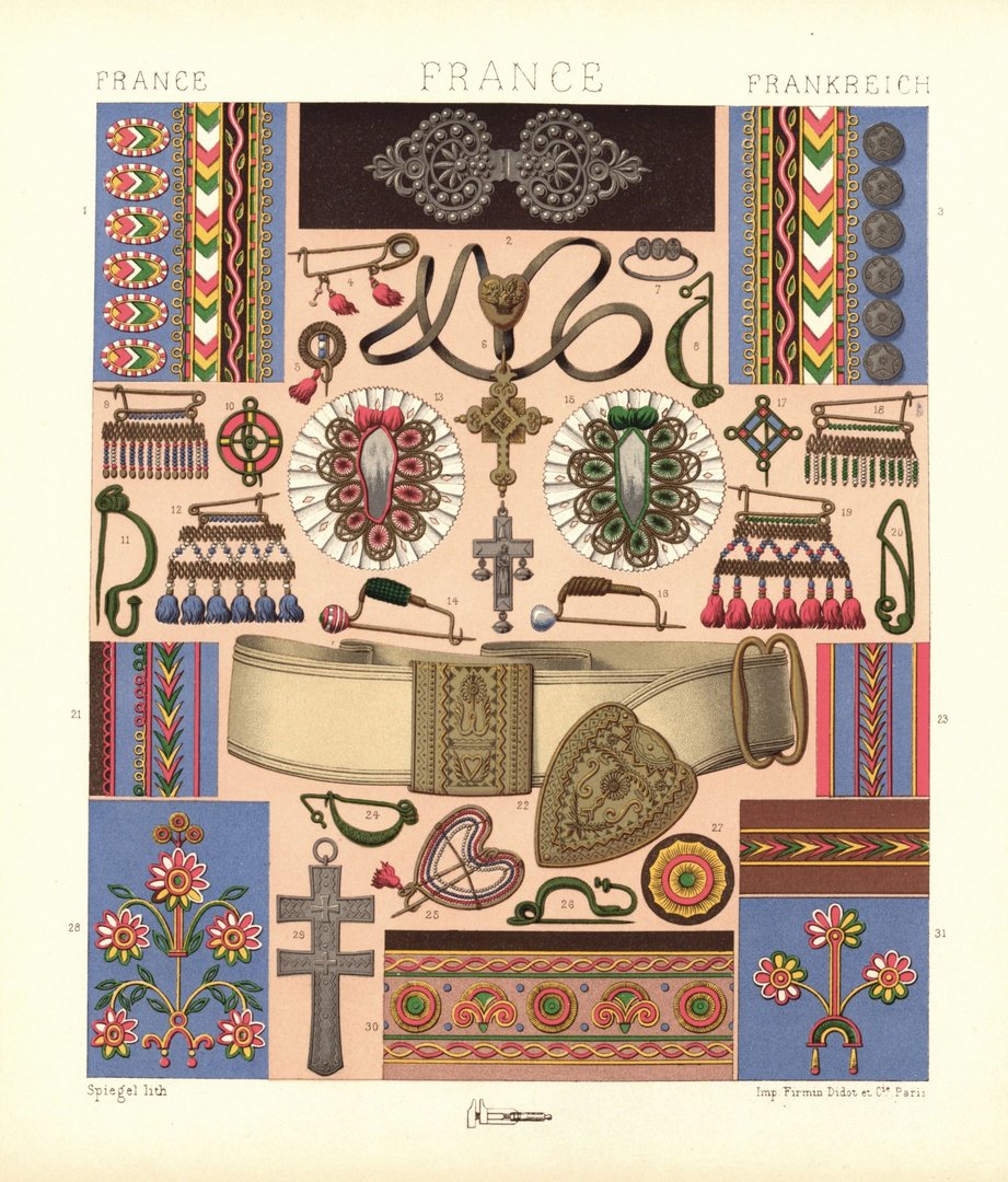 Frankreich. Bretagne. Stickereien, Schmuckgegenstände. 19.Jhd . Lithografie von 1888. (T497)