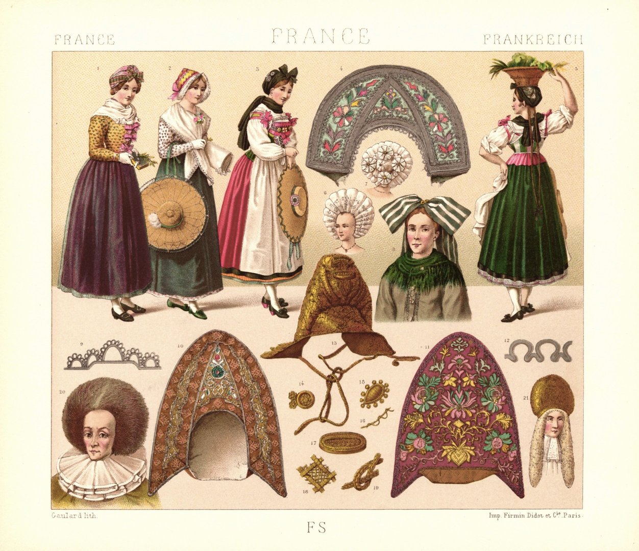 Frankreich. Elsass, verschiedene Haartrachten des 17. Jhd. Volkstracht. Lithografie von 1888. (T488)