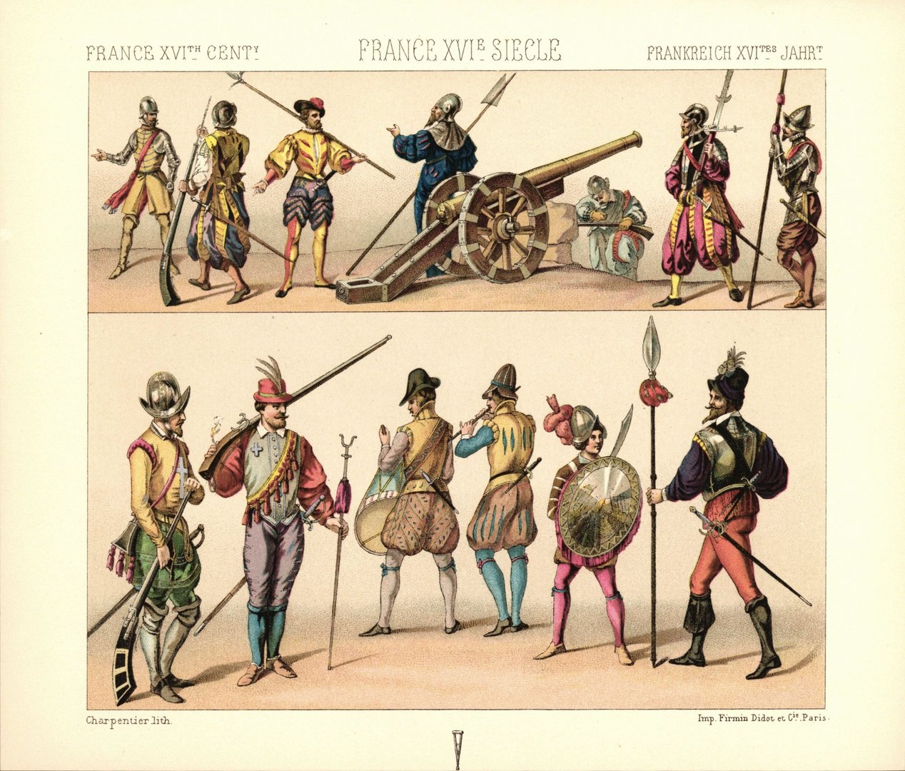 Frankreich. Landsknechte, Musketier, Schweizer Artillerist, 16. Jhd. Lithografie von 1888. (T257)