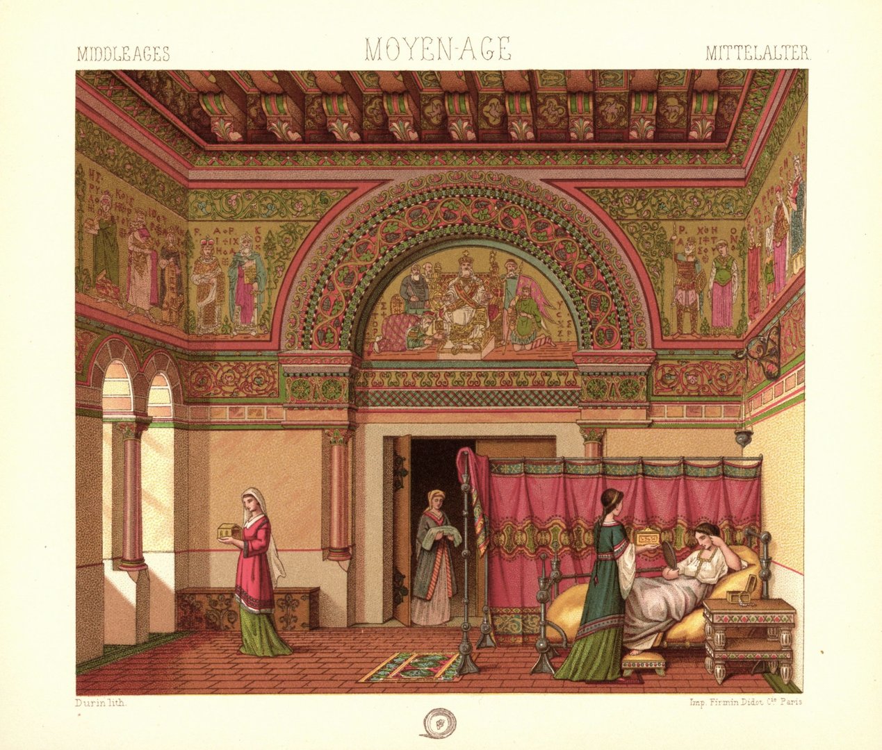 Frankreich. Mittelalter. Innenraum eines Herrenhauses 9.-11. Jhd. Lithografie von 1888. (T185)