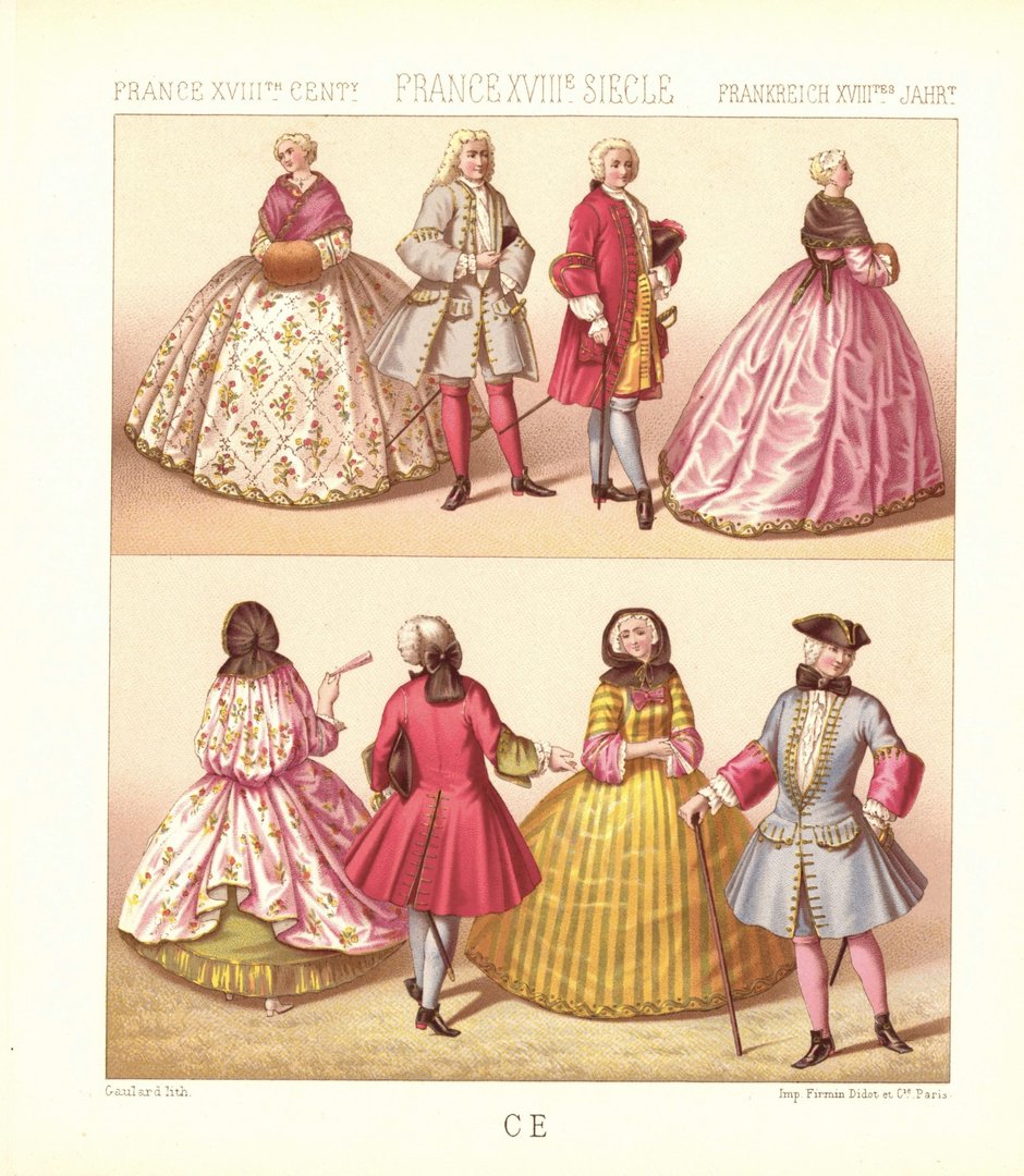 Frankreich. Modebeispiele der ersten Hälfte des 18. Jhd. Lithografie von 1888. (T368)