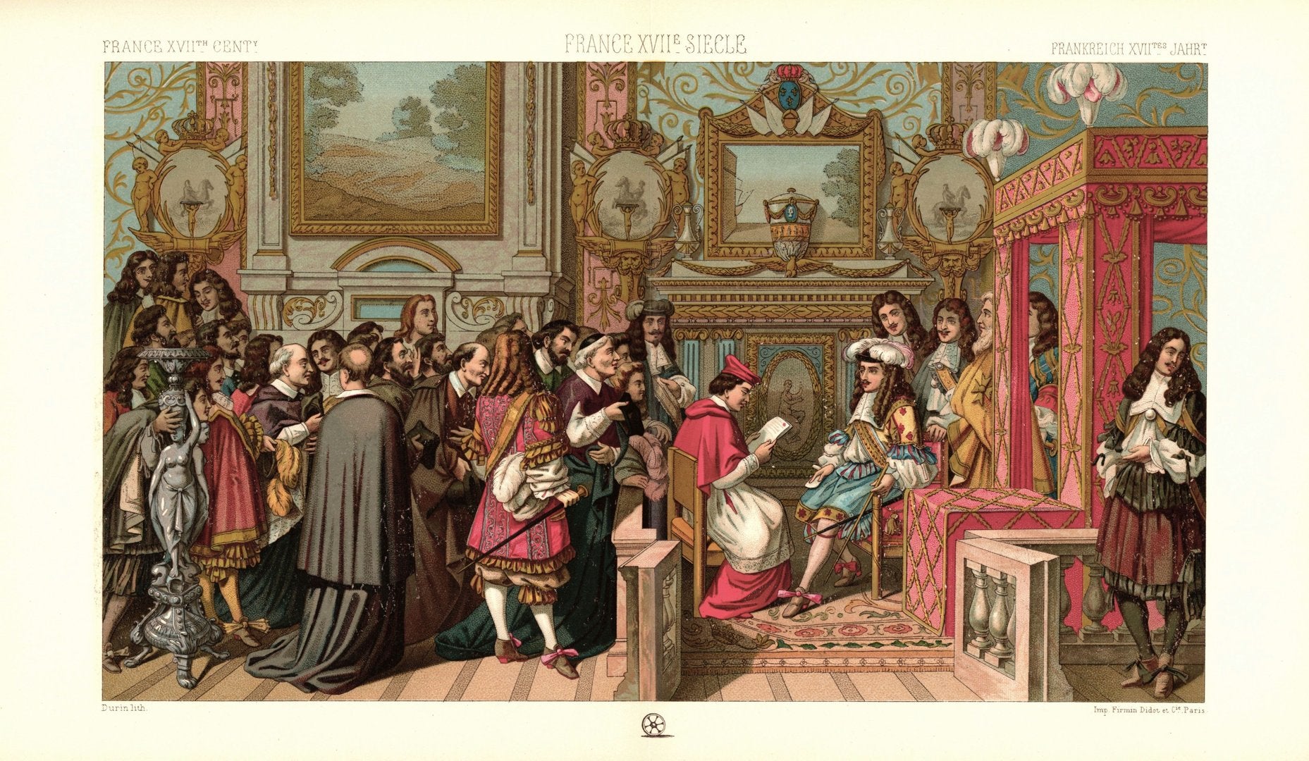 Frankreich. Prunkzimmer. Königliche Audienz mit Geistlichen. 17. Jhd. Lithografie von 1888. (T344)