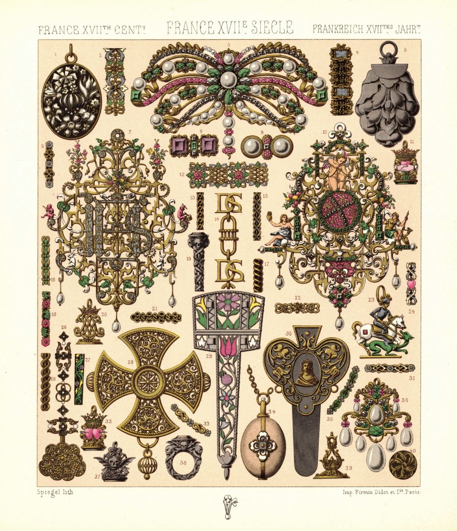 Frankreich. Schmuck, Emailschmuck, Alltagsgegenstände. 17.Jhd. Lithografie von 1888. (T341)
