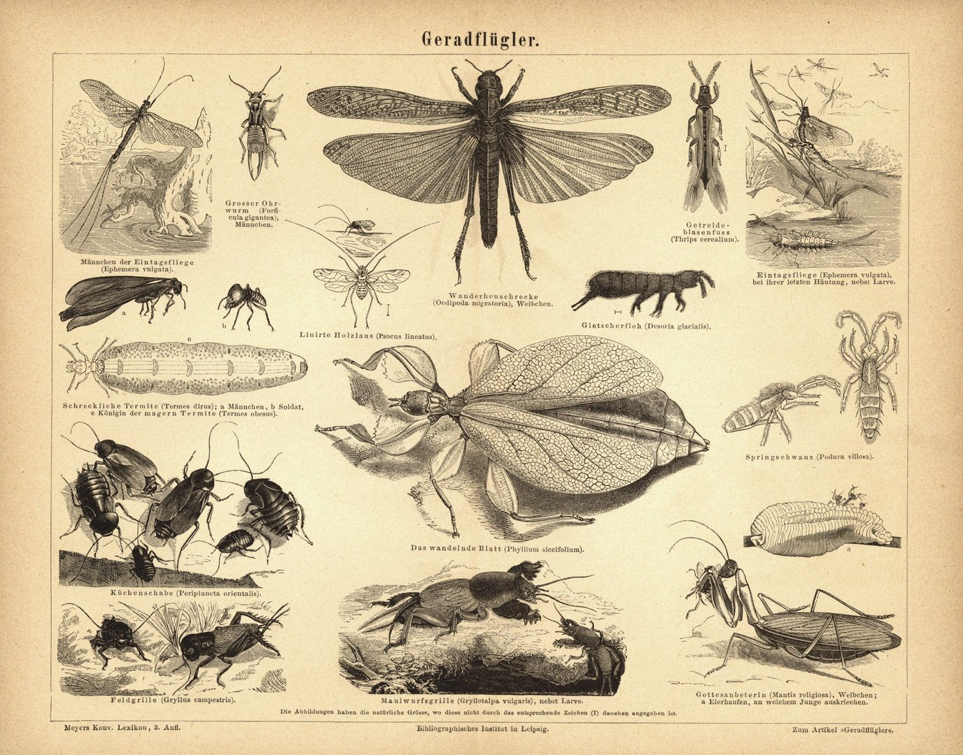 Geradflügler, Insekten. Buchillustration (Stich) von 1876