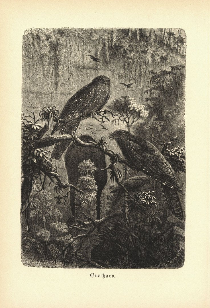 Guácharo oder Fettschwalm, Vogel. Buchillustration (Holzschnitt) von 1890