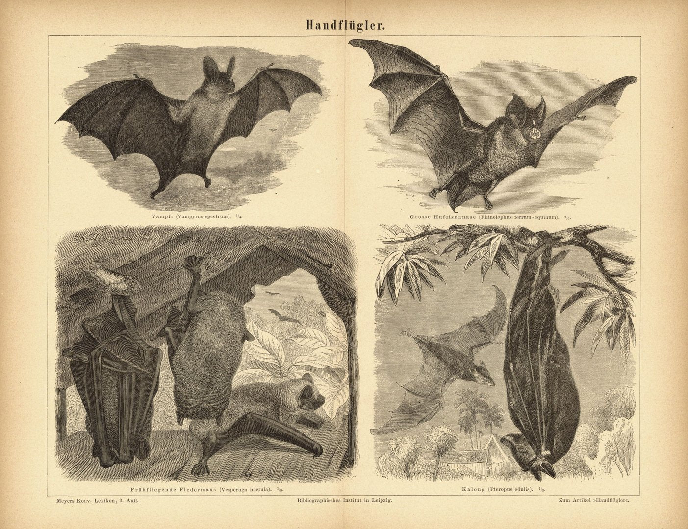 Handflügler, Fledermäuse. Buchillustration (Stich) von 1876