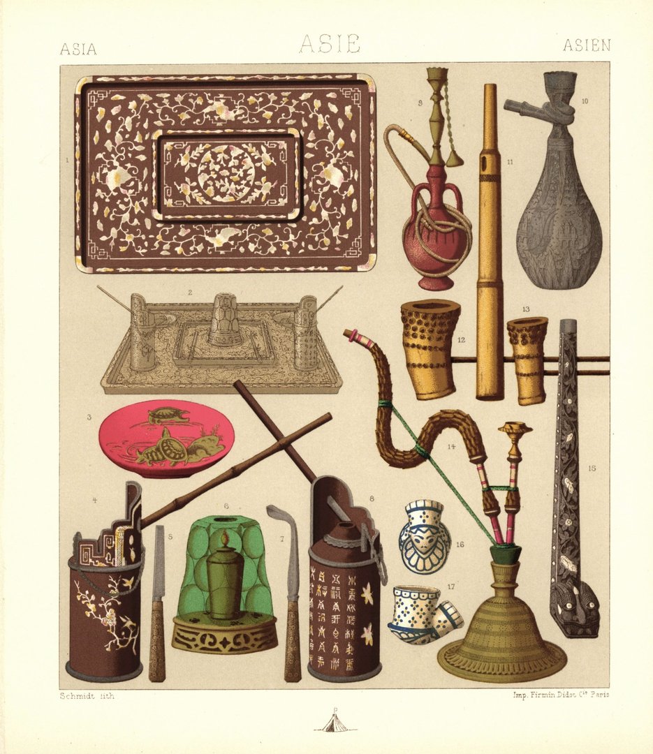 Indien, Persien, Java. Rauchutensilien, Wasserpfeife. Lithografie von 1888. (T109)