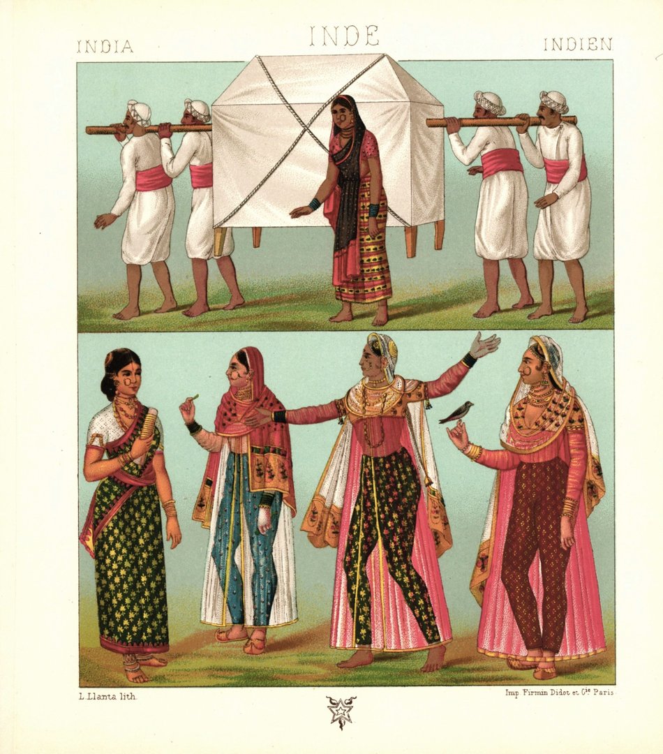Indien. Transportmittel, Gouvernante, Tänzerinnen. Lithografie von 1888. (T124)