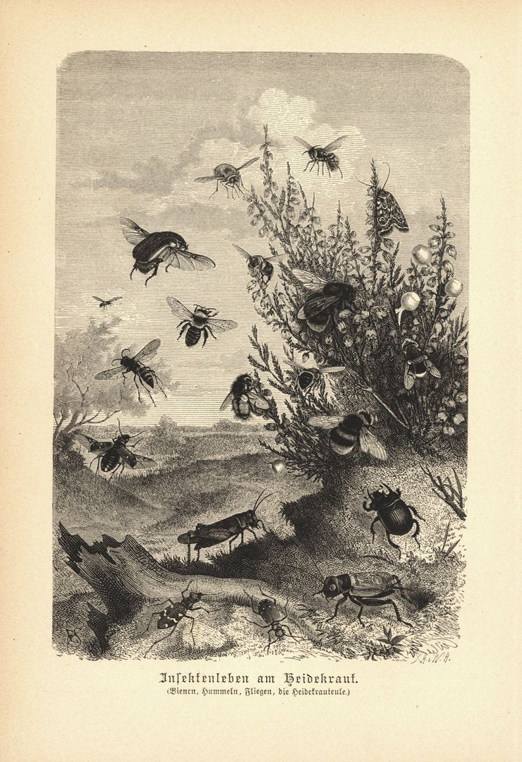 Insekten am Heidekraut, Bienen, Hummeln, Fliegen. Buchillustration (Holzschnitt) von 1890