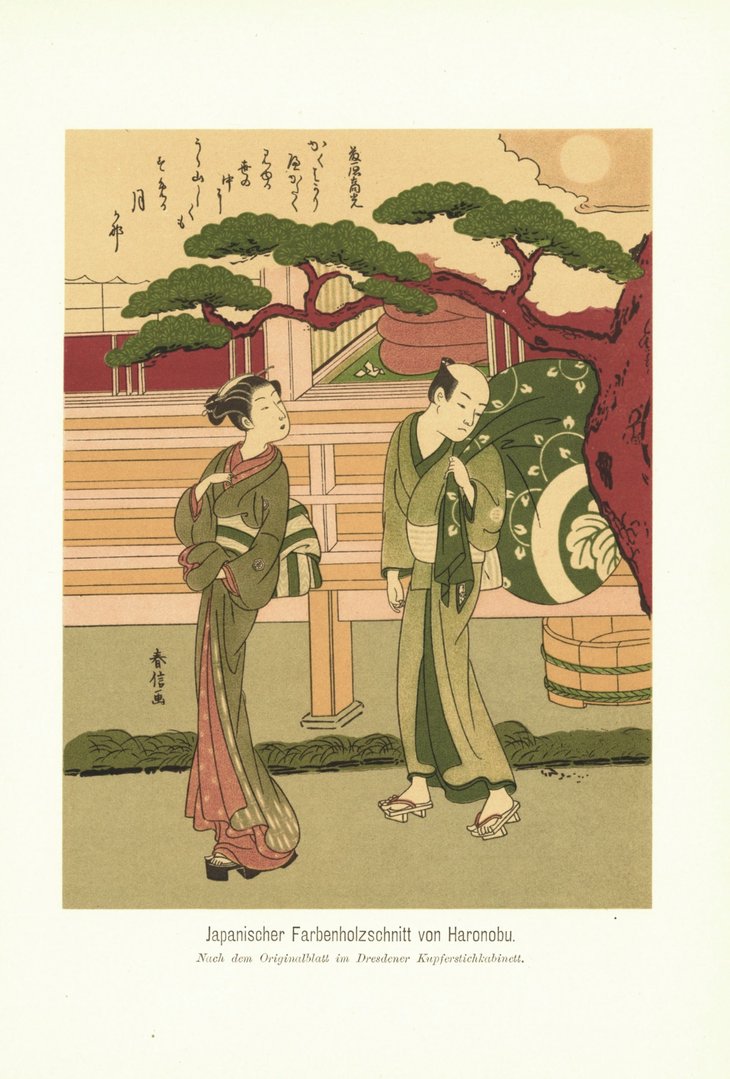 Japanischer Farbenholzschnitt von Haronobu. Lithografie von 1905