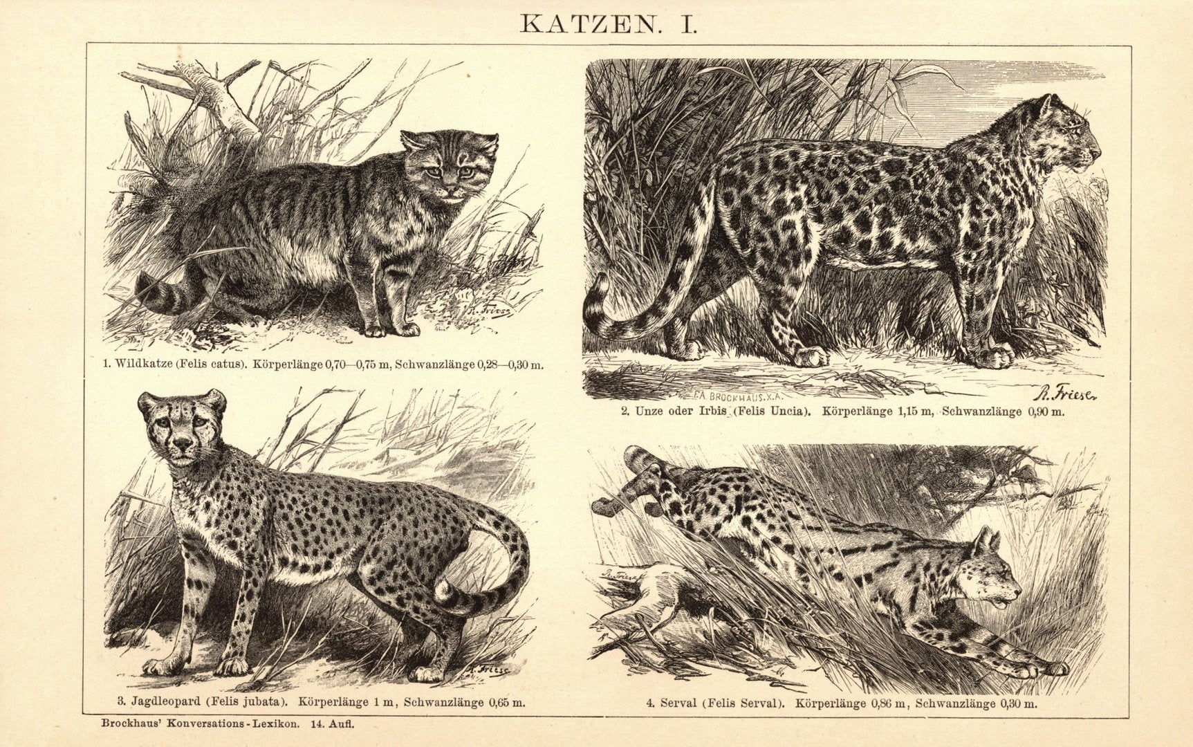 Katzen, Raubkatzen. Buchillustration (Stich) von 1897