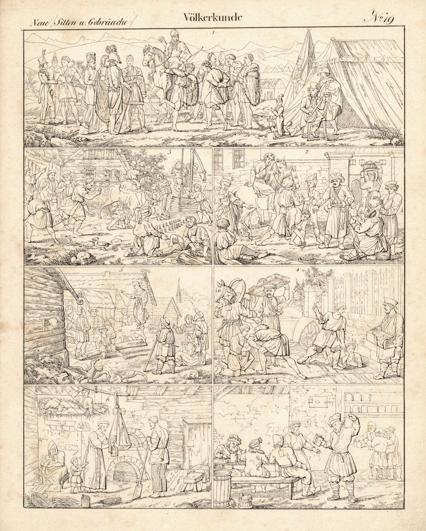 Kaukasische Stämme, Gebräuche, Sitten, Völkerkunde Nr. 19. Lithografiertes Blatt von 1830.