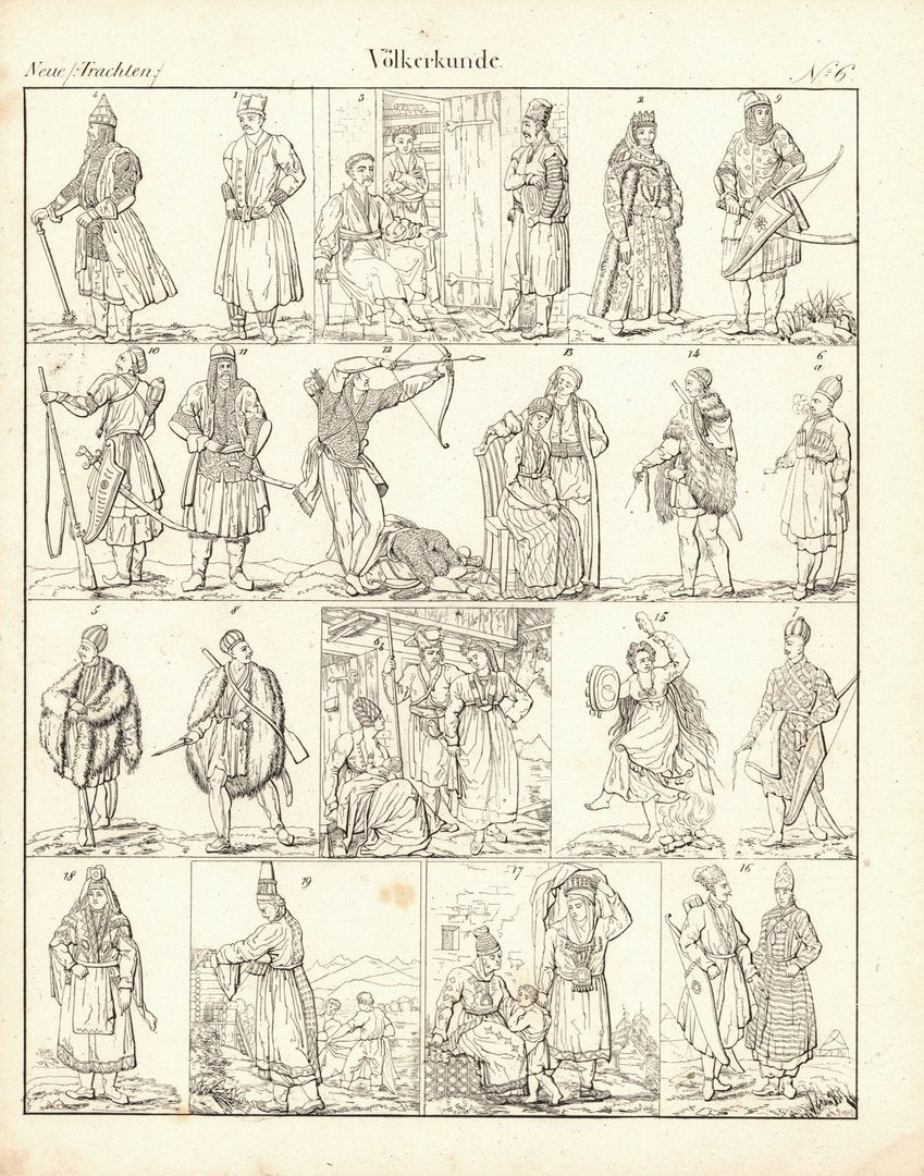 Kaukasische Stämme, Neue Trachten, , Völkerkunde Nr. 6. Lithografiertes Blatt von 1830.