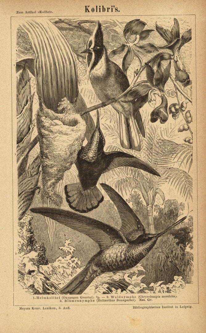 Kolibris. Buchillustration (Stich) von 1876