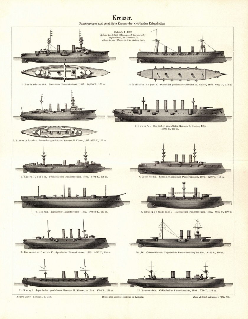 Kreuzer, Panzerkreuzer und geschützte Kreuzer. Buchillustration (Stich) von 1898