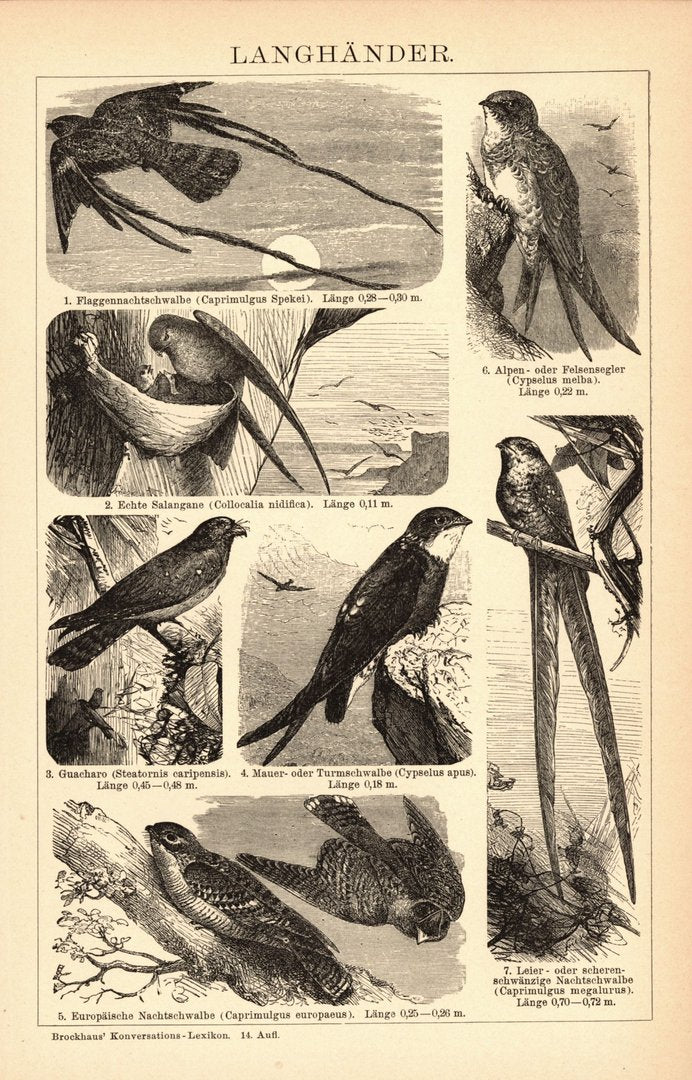 Langhänder, Vögel. Buchillustration (Stich) von 1897