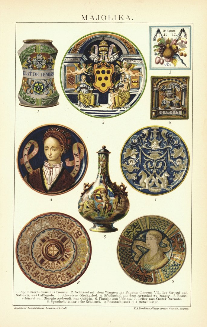 Majolika-Keramik ist eine Art bunter Töpferware, die um 1400 in Italien entstanden ist. Der Name "Majolika" stammt von dem spanischen Wort für Mallorca, einer Insel vor der italienischen Küste, auf der diese Keramik erstmals hergestellt wurde. Majolika zeichnet sich durch ihre glänzende Glasur und ihre leuchtenden Farben aus. Ursprünglich wurde Majolika für dekorative Zwecke verwendet, aber schon bald wurde sie auch für Gebrauchsgegenstände wie Teller, Schalen und Vasen beliebt Die Majolikaproduktion erreichte ihren Höhepunkt im 16. Jahrhundert, während der italienischen Renaissance. Zu dieser Zeit wurden komplizierte Designs und komplexe Muster entwickelt, und Majolika wurde zu einem begehrten Statussymbol für den Adel. Im Laufe der Zeit ging die Produktion von Majolika jedoch zurück, da sich die Mode änderte und neue Keramiktechnologien eingeführt wurden. Heute wird Majolika als Sammlerstück und als ein Stück Kunstgeschichte geschätzt.