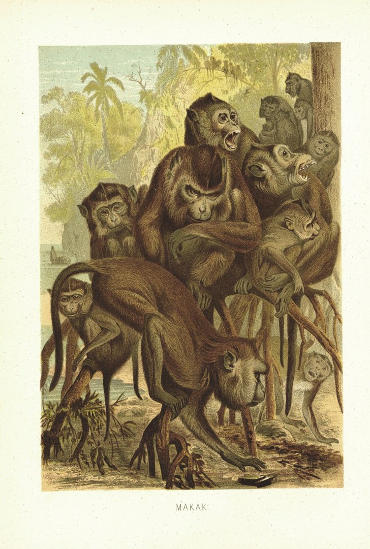 Makak, Affen. Lithografie von 1890