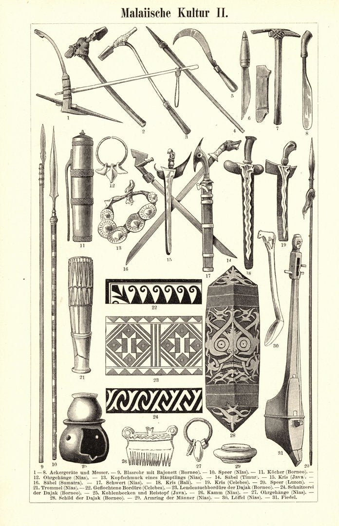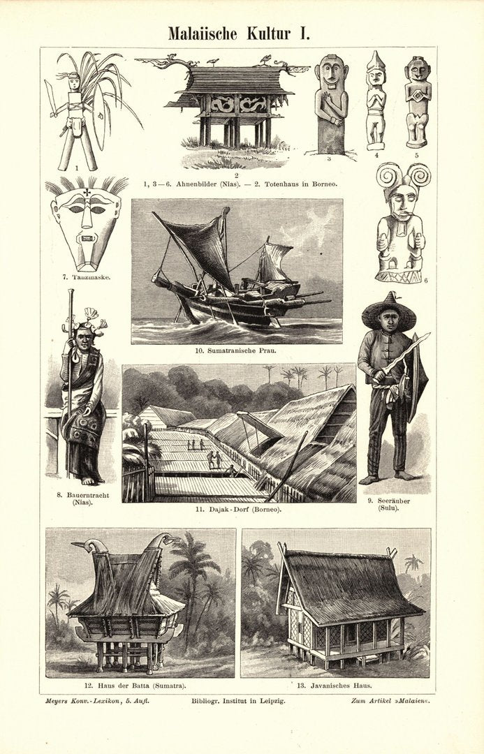 Malaiische Kultur. Buchillustration (Stich) von 1896