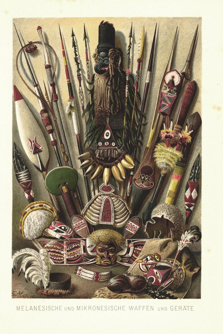 Melanesische und Mikronesische Waffen und Geräte. Lithografie von 1886