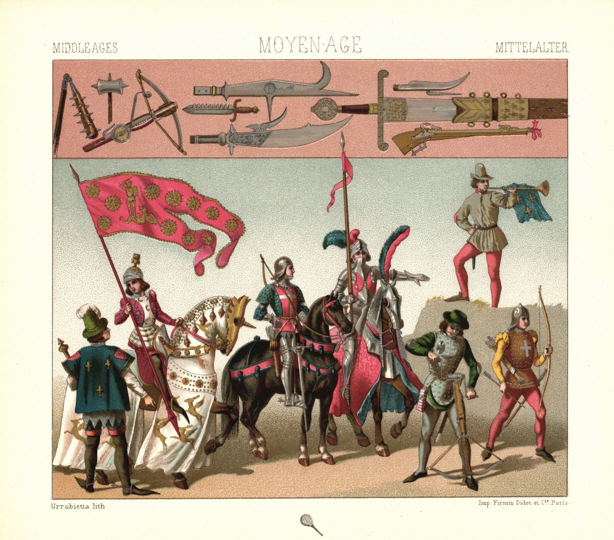 Mittelalter. Frankreich. 1439 bis 1450. Militärtrachten. Rüstungen. Lithografie von 1888. (T218)
