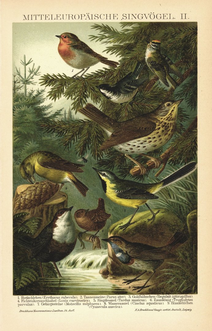 Mitteleuropäische Singvögel II. Lithographie von 1895