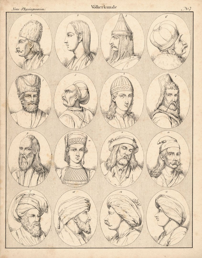 Mongolische, Kaukasische Stämme, Physiognomien, Völkerkunde Nr.1. Lithografiertes Blatt von 1830.