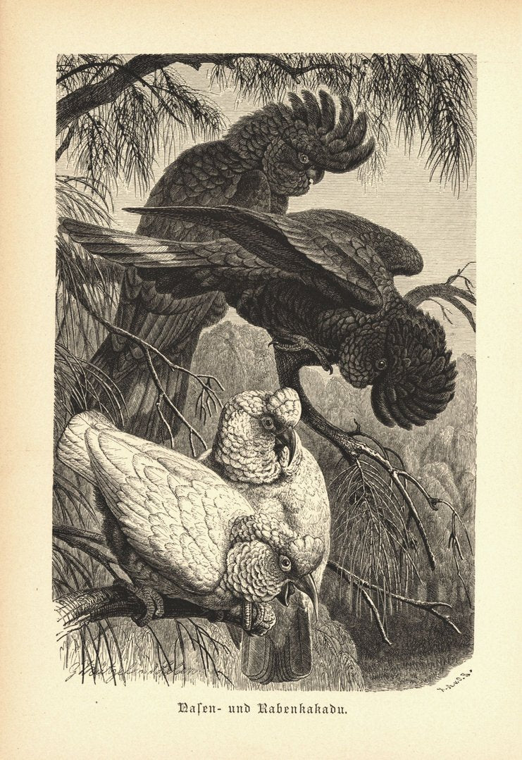 Nasen- oder Rabenkakadu, Papagei. Buchillustration (Holzschnitt) von 1890