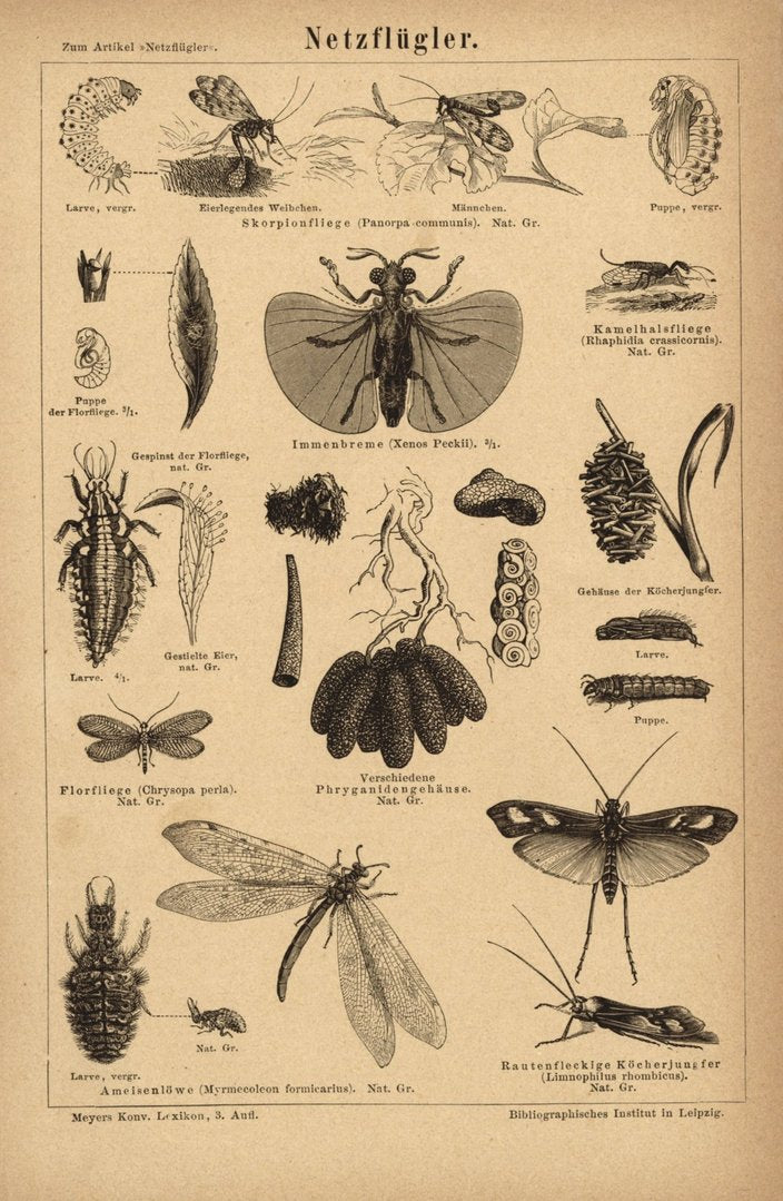 Netzflügler, Insekten. Buchillustration (Stich) von 1877