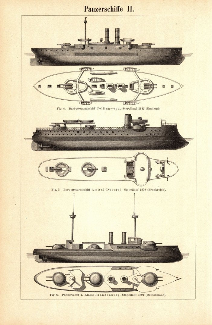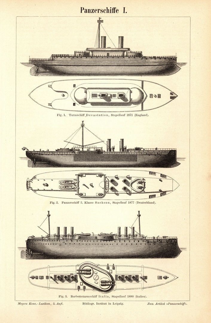 Panzerschiffe. Buchillustration (Stich) von 1897