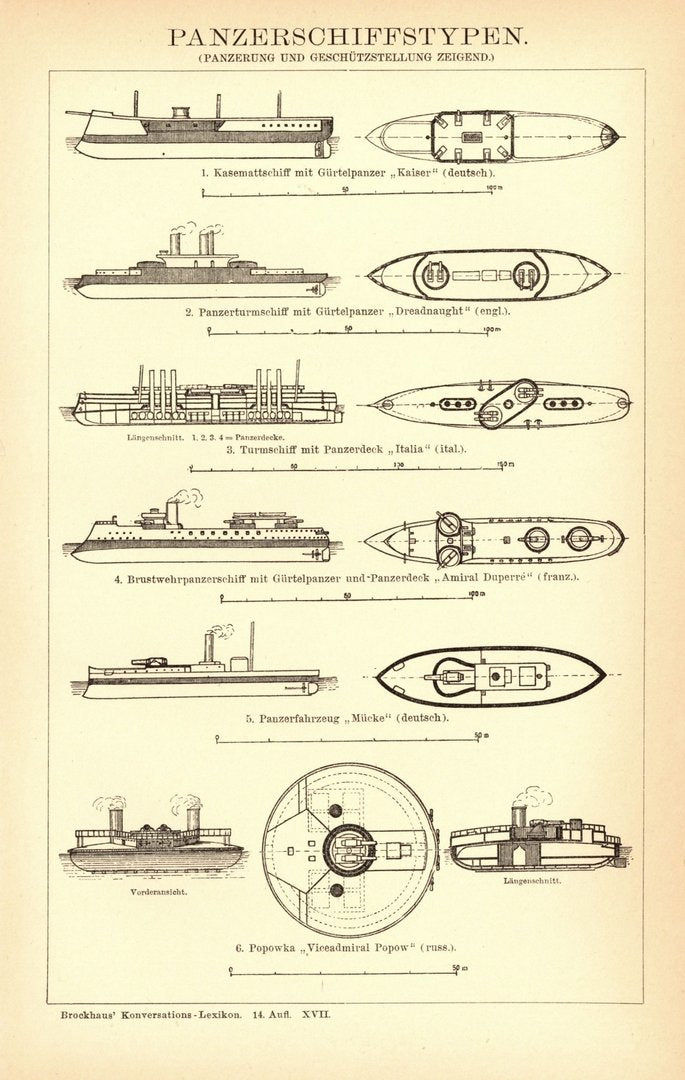 Panzerschiffstypen. Buchillustration (Stich) von 1897