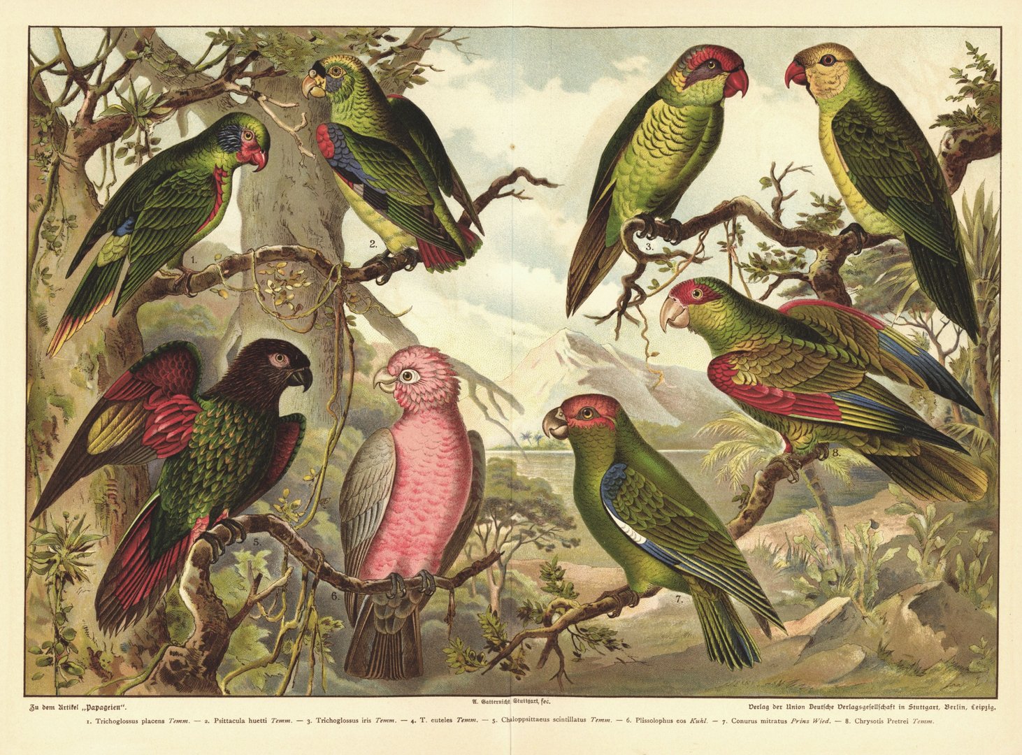 Papageien. Lithographie von 1892