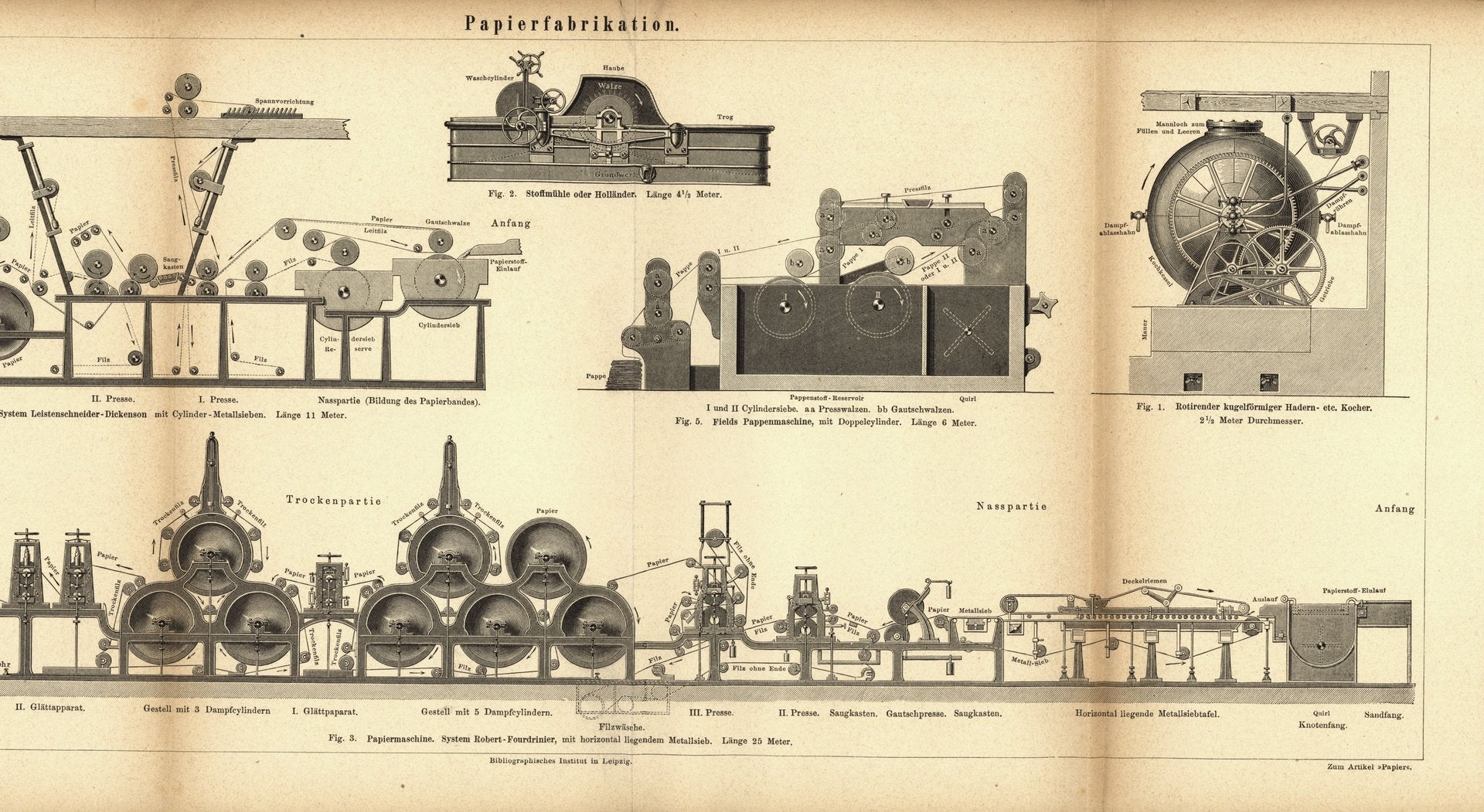 Papierfabrikation. Buchillustration (Stich) von 1877