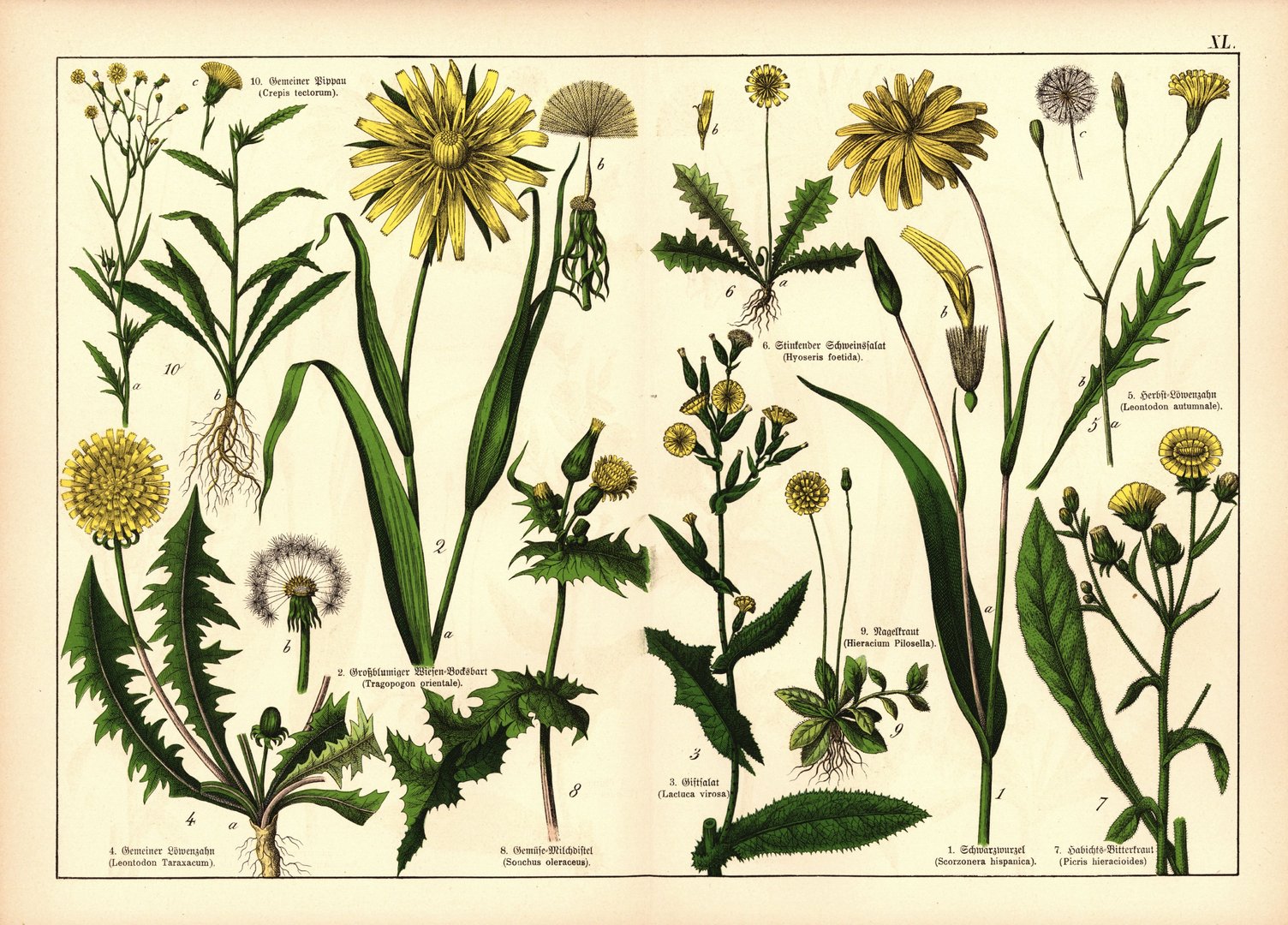Pflanzen, Syngenesia, z.B. Löwenzahn. Farblithografie von 1887. Tafel 40