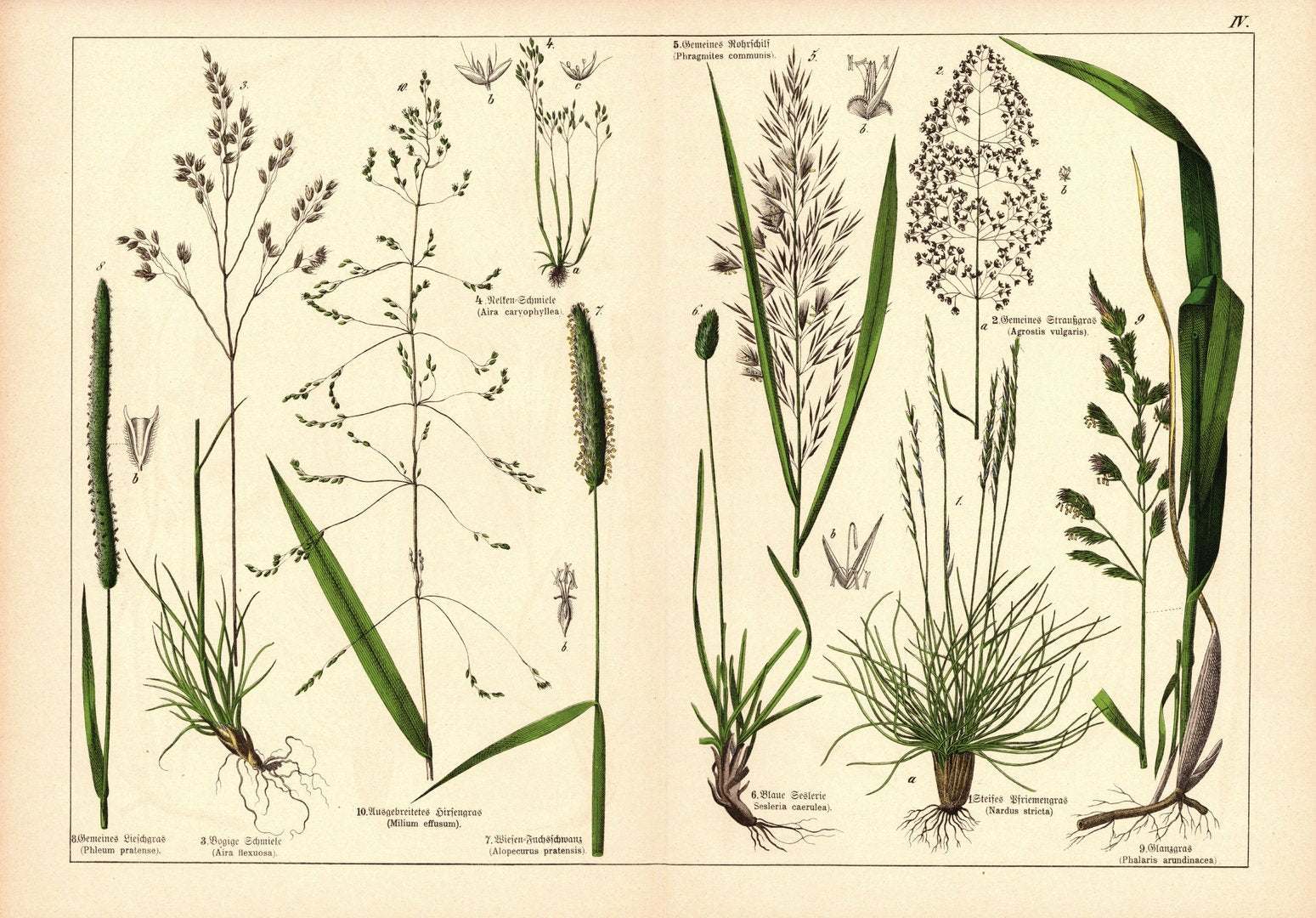 Pflanzen, Triandria, z.B. Straußgras. Farblithografie von 1887. Tafel 4