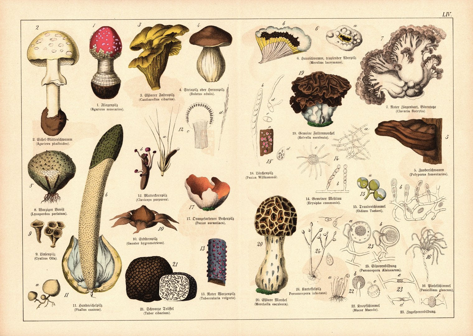 Pflanzen, z.B. Morchel. Farblithografie von 1887. Tafel 54