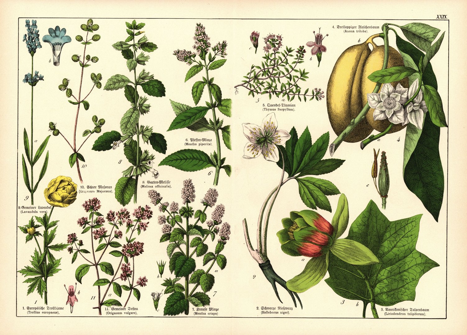 Pflanzen, z.B. Trollblume. Farblithografie von 1887. Tafel 29