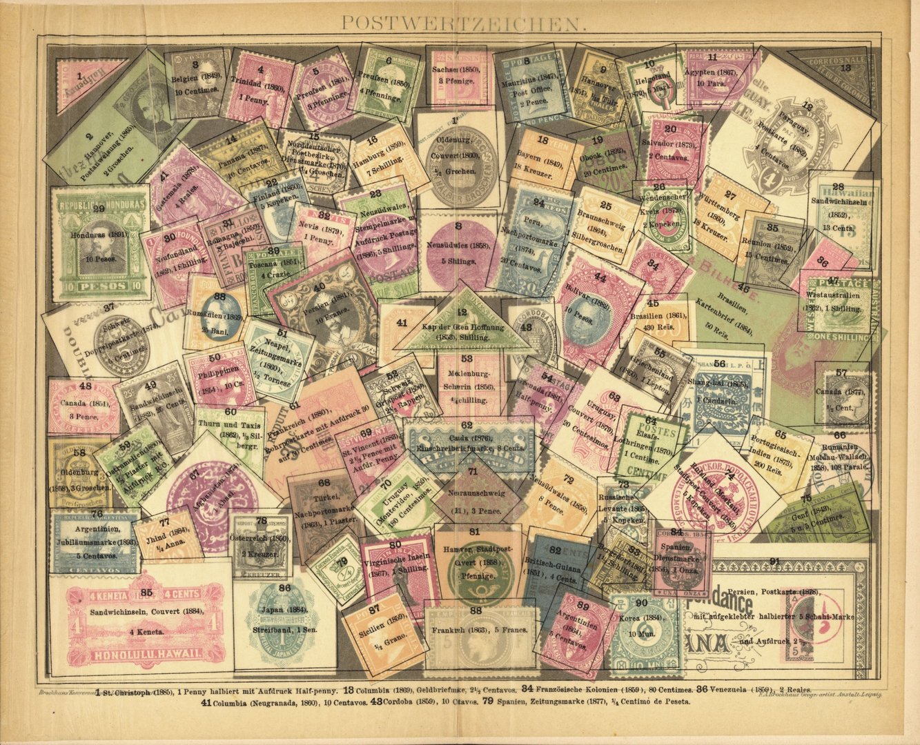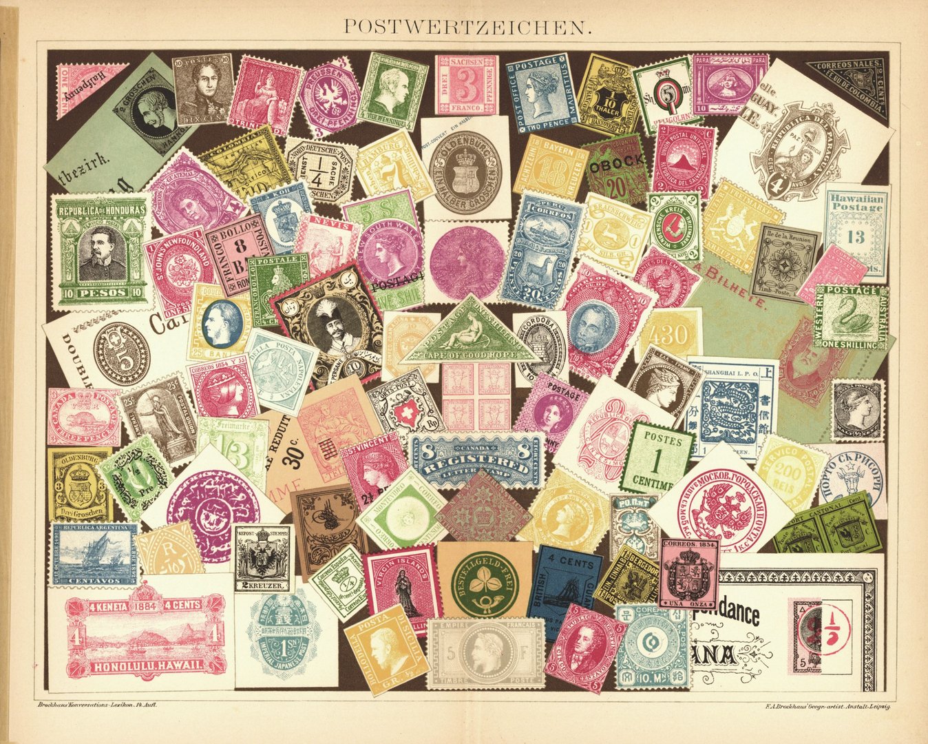 Postwertzeichen, Briefmarken. Lithographie von 1894