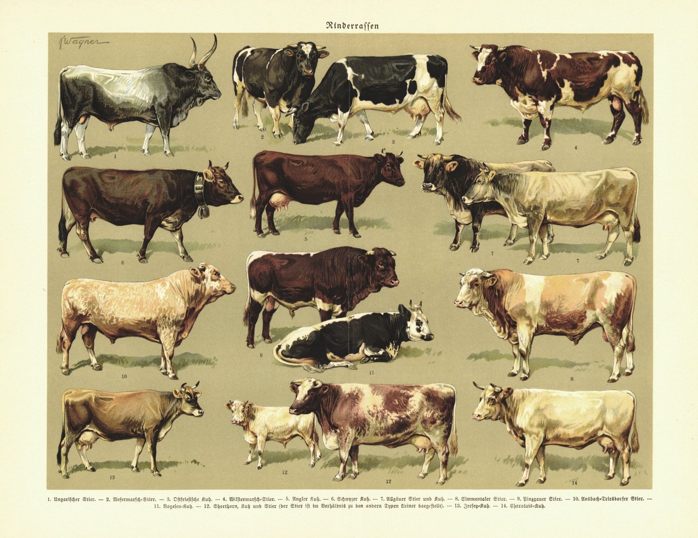 Rinderrassen. Lithographie von 1925