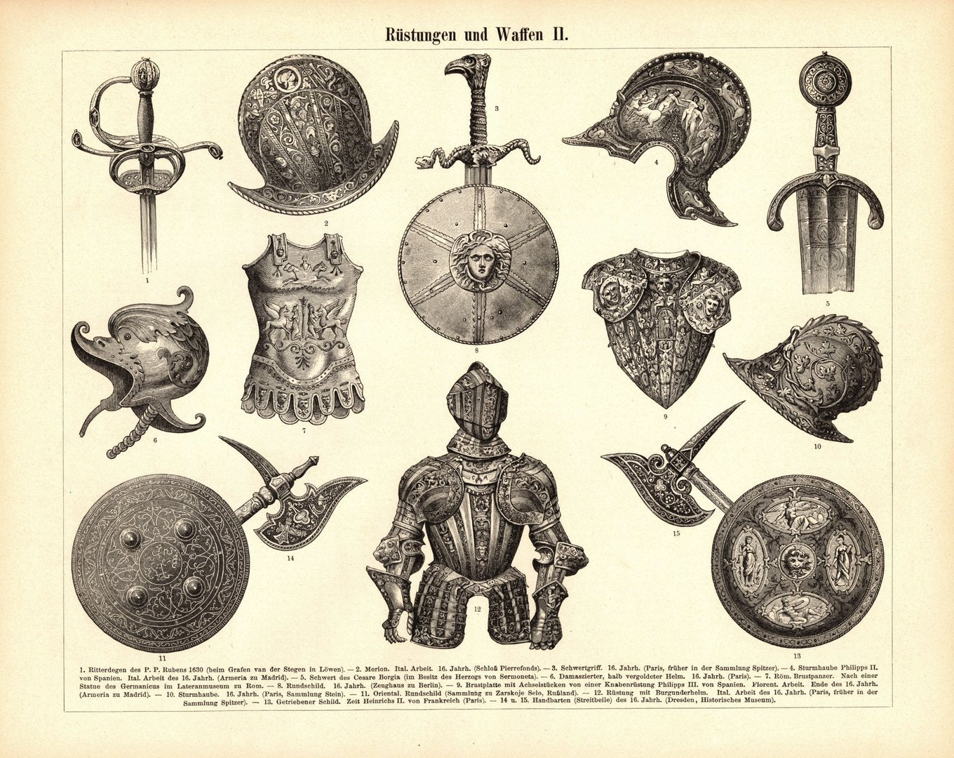 Rüstungen und Waffen. Buchillustration (Stich) von 1897