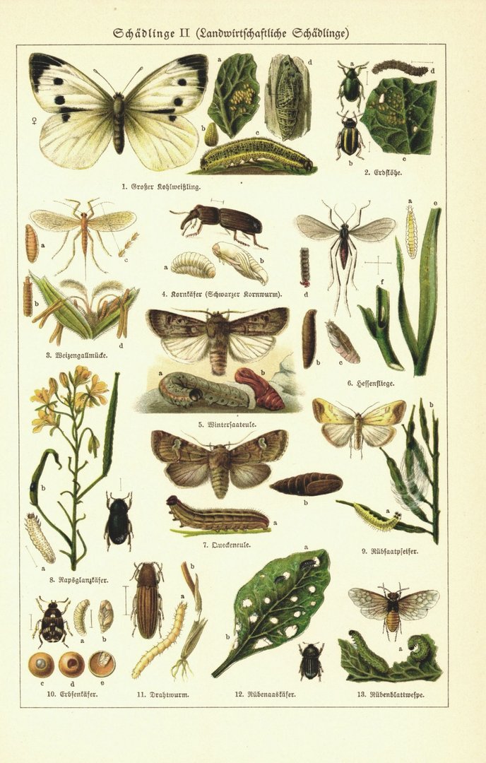 Schädlinge, Landwirtschaftliche Schädlinge. Lithographie von 1925
