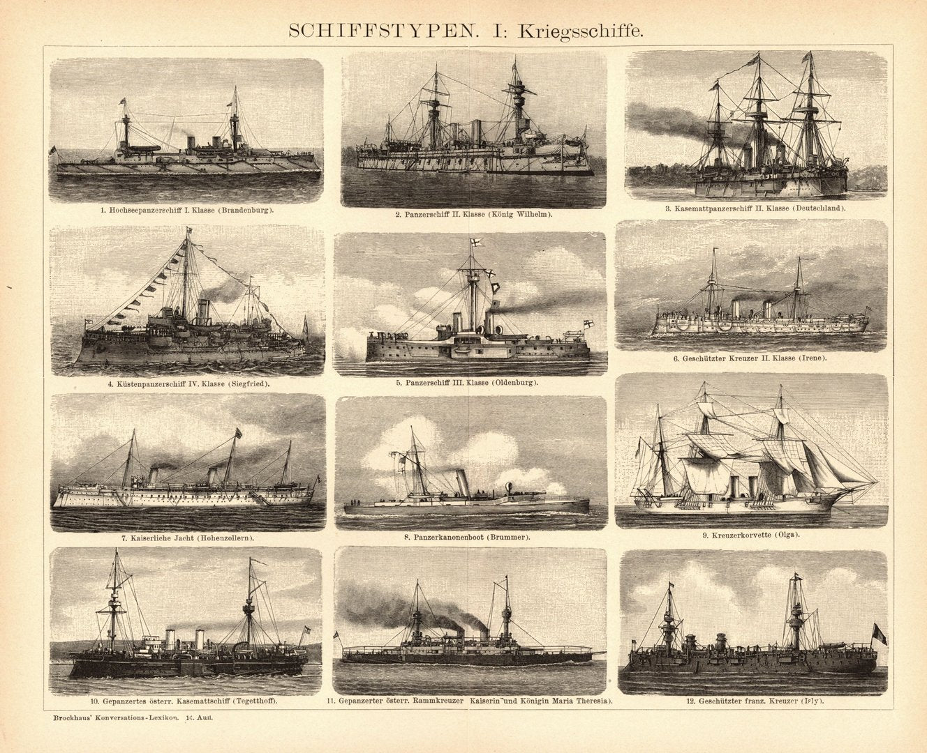 Schiffstypen, Kriegsschiffe. Buchillustration (Stich) von 1897